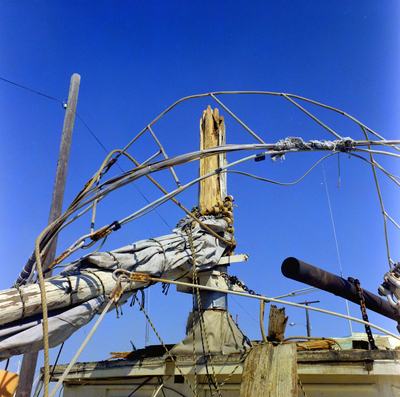 Fishing boat Penny Leigh. Close up of broken mast and metal rods surrounding it. Photo taken for Fowler, White, and Gillen.