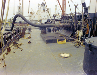 S. S. Phillipa Washington deck. A large hose on an adjacent dock is connected to a valve on the ship. Photo taken for Fowler, White, Gillen, and Boggs.