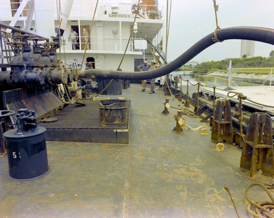 S. S. Phillipa Washington deck. A large hose on an adjacent dock is connected to a valve on the ship. Two workers are standing on deck and two men are standing on the ship's superstructure. Photo taken for Fowler, White, Gillen, and Boggs.