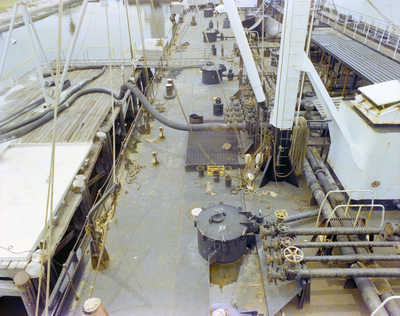 S. S. Phillipa Washington deck. A large hose on an adjacent dock is connected to a valve on the ship. Photo taken for Fowler, White, Gillen, and Boggs.