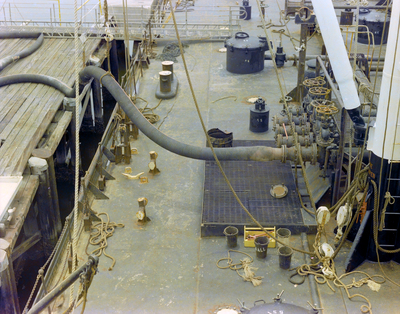 S. S. Phillipa Washington deck. A large hose on an adjacent dock is connected to a valve on the ship. Photo taken for Fowler, White, Gillen, and Boggs.