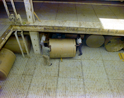 M/V EA cargo hold. Three workers are moving a large cylinder. Photo taken for Fowler, White, and O'Sullivan.