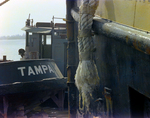 Tugboat D. T. Sheridan. A bundle of rope hangs from the bow of the tugboat. "Tampa" is printed on an object behind the tugboat. Photo taken for Fowler and White.