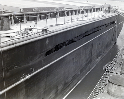 Barge Patricia Sheridan. A large gash is in its port side hull. Photo taken for Fowler and White.