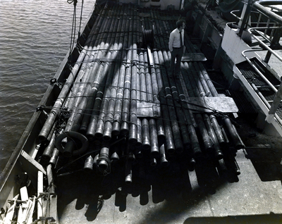 Cargo secured on an unidentified ship. Long pipes are bound together on the deck of the ship. A man stands on the tubes. Photo taken for Fowler and White.