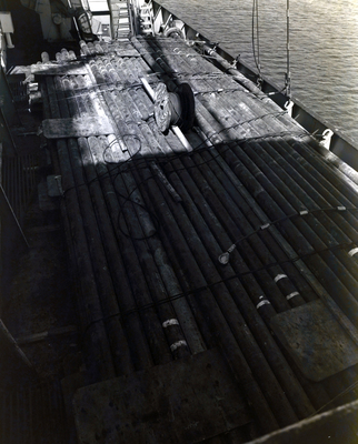 Cargo secured on an unidentified ship. Long pipes are bound together on the deck of the ship. A spool of cable sits on top of the pipes. Photo taken for Fowler and White.