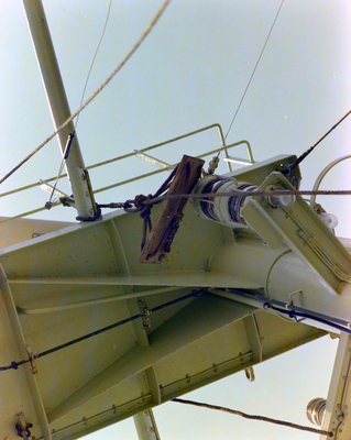 M/V Lynton Grange. A plank of wood is suspended from the top of the mast, with a length of rope hanging from it. Photo taken for Fowler and White.