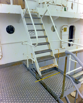 M/V Gulfdeer. A measuring stick measures a distance from a step on a stairway. A man is walking out of a room on an upper level of the superstructure. Photo taken for Fowler and White.