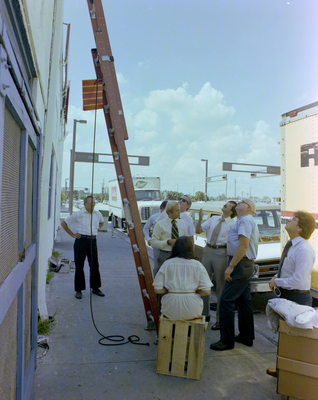 U-Save grocery store. Several people are standing around a ladder in front of a storefront, some of them are looking up at the top of the building. An intersection with E Zach Street can be seen in the background. Photo taken for Fowler and White.