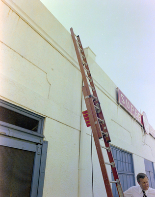 U-Save grocery store. A man stands behind a ladder leaning against the building. The U-Save Super Market sign can be seen on the front of the building. Photo taken for Fowler and White.