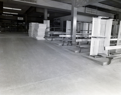 Benches at a dog track in Tampa, Florida. A sign saying "Walk Do Not Run" can be seen above a doorway in the background. Photo taken for Fowler, White, and Gillen.