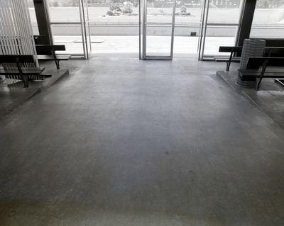 Benches at a dog track in Tampa, Florida, facing windows and doorway to the track outside. Photo taken for Fowler, White, and Gillen.