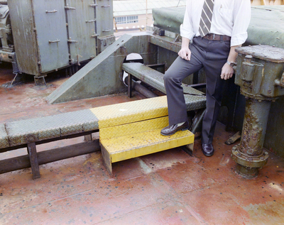 Metal steps painted yellow on an unidentified ship. The steps are part of a narrow, raised metal platform. A man is standing next to the platform with one foot on the bottom step. Photo taken for Fowler and White.