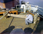Scaffolding equipment involved in a fatal accident on a ship. A man crouches by the scaffolding equipment. Photo taken for Fowler and White.