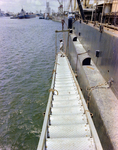 M/V Verr Varuna. A worker in white coveralls and a hard hat stands on a gangway suspended from the side of the ship. Other ships can be seen in the harbor. Photo taken for Fowler and White.