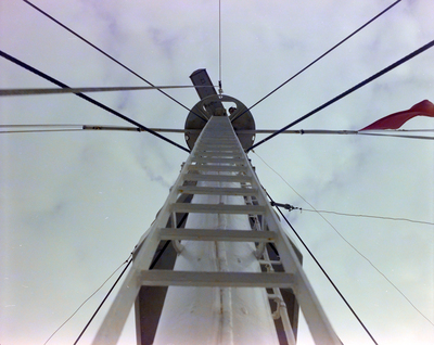 M/V Gulf Tiger. A view looking up the ladder leading to the top of the mast. A person is looking down through the opening at the top of the mast. Photo taken for Fowler and White.