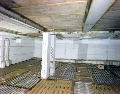 Cargo hold on unidentified ship. A banana box sits on the ground. Photo taken for Fowler and White.