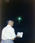 The S. S. Louisiana Sulphur. There is a light on the ship that emits a green light. A man is standing below the light holding a book open. Photo taken for Fowler and White.