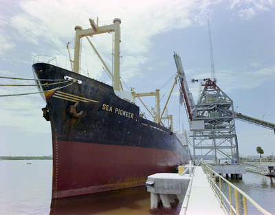 M/V Sea Pioneer. The ship's name is printed on the port side bow of the ship. A shiploader is next to the ship on the harbor. Photo taken for Fowler and White.