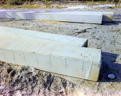 A construction site in Sun City Center, Florida. Concrete pillars lie on the ground, with handwritten measurement marks evenly spaced along their length. Photo taken for Fowler and White.