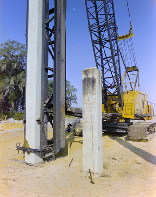 A construction site in Sun City Center, Florida. A crane sits behind two erect pillars. One is encased in a pile driving rig. Photo taken for Fowler and White.