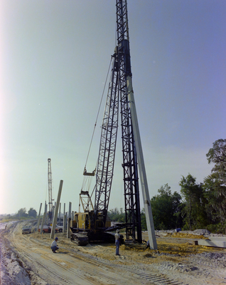 A construction site in Sun City Center, Florida. A crane is erecting a concrete pillar into a pile driver while workers stand on the ground below. Photo taken for Fowler and White.