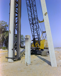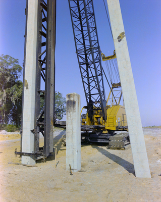 A construction site in Sun City Center, Florida. A crane sits behind three erect pillars. One is encased in a pile driving rig. Photo taken for Fowler and White.