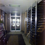 A staircase on the cruise ship Vera Cruze. Double glass doors are at the end of a hallway. Photo taken for Fowler and White.