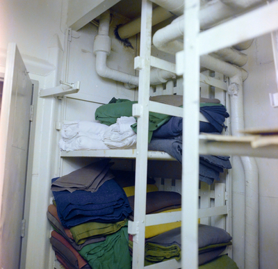 Shelves of folded towels on board the S. S. California. Photo taken for Fowler and White.