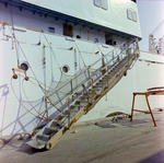A ship is docked at a harbor by the Gulf Florida Terminal Company building in Tampa, Florida. A gangway leading off the ship. Photo taken for Fowler and White.