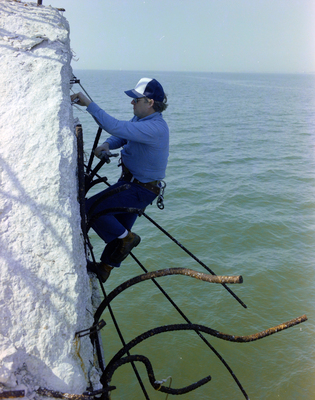 Skyway Bridge in Tampa Bay, Florida. A man is climbing up the side of a damaged concrete pier. Photo taken for Fowler and White.