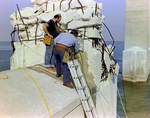 Skyway Bridge in Tampa Bay, Florida. Workers stand on a section of a damaged concrete pier. Photo taken for Fowler and White.
