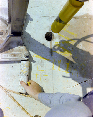 Skyway Bridge in Tampa Bay, Florida. A worker holds a cylinder of concrete removed from a section of pier. Photo taken for Fowler and White.