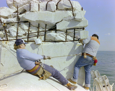 Skyway Bridge in Tampa Bay, Florida. Workers stand on a section of a damaged concrete pier. Photo taken for Fowler and White.
