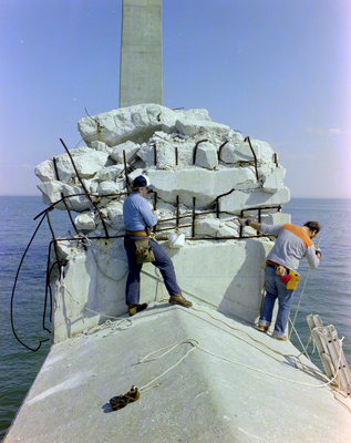 Skyway Bridge in Tampa Bay, Florida. Workers stand on a section of a damaged concrete pier. Photo taken for Fowler and White.