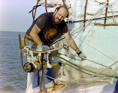 Skyway Bridge in Tampa Bay, Florida. A worker stands on a section of a damaged concrete pier. Photo taken for Fowler and White.