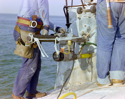 Skyway Bridge in Tampa Bay, Florida. A worker stands on a section of a damaged concrete pier operating a concrete core drill. Photo taken for Fowler and White.