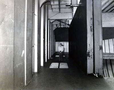M/V Naxos cargo hold. A man stands in the middle of a walkway next to the cargo hold. Photo taken for Fowler and White.