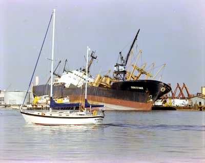 Photo had to be taken between Jan 12-24, 1982, when ship was listing due to issues during repairs. Located at Tampa Shipyards Inc. near Sparkman Channel.
