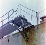 An unidentified red and grey ship. Close up of the ship's gangplank, where it connects with the deck. Photo taken for Fowler and White.