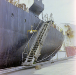 An unidentified grey ship. The photo is centered on the ship's gangplank. Photo taken for Fowler and White.