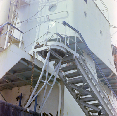An unidentified grey and white ship. Close up of the ship's gangplank, where it connects with the deck. Photo taken for Fowler and White.