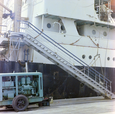 An unidentified grey and white ship. The photo is centered on the ship's gangplank. Photo taken for Fowler and White.