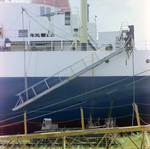 Unidentified red, blue, and white ship. The photo is centered on the ship's gangplank. Photo taken for Fowler and White.