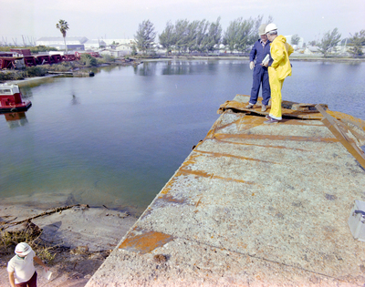Workers standing on an unidentified metal structure at a junk yard. Photo taken for Fowler and White.
