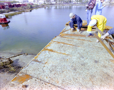 Workers standing on an unidentified metal structure at a junk yard. Photo taken for Fowler and White.