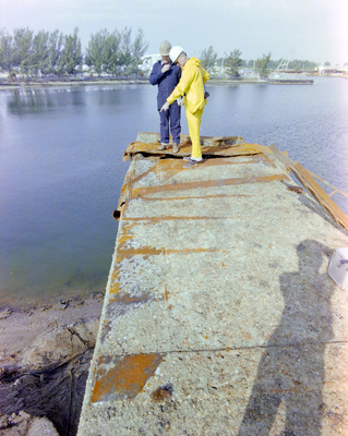 Workers standing on an unidentified metal structure at a junk yard. Photo taken for Fowler and White.