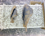 An unidentified metal structure at a junk yard. A photo of a metal grating with shells and barnacles affixed to its surface. Photo taken for Fowler and White.