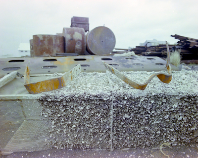 An unidentified metal structure at a junk yard. A photo of a metal grating with shells and barnacles affixed to its surface. Photo taken for Fowler and White.