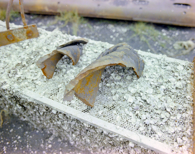 An unidentified metal structure at a junk yard. A photo of a metal grating with shells and barnacles affixed to its surface. Photo taken for Fowler and White.